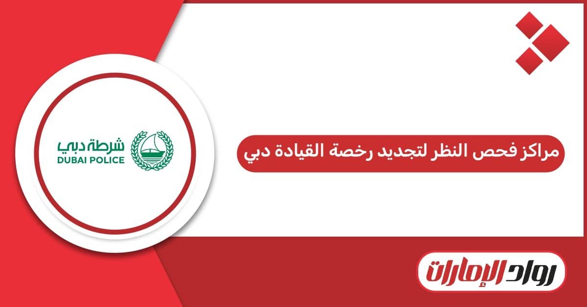 توجد الكثير من مراكز فحص النظر لتجديد رخصة القيادة في دبي، ويهدف هذا الفحص إلى التحقق من قوة نظر السائقين ومقدرتهم الصحية على قيادة المركبات بمختلف أنواعها على الطرقات بأمان، ويمكن الذهاب إلى أي منها خلال أوقات العمل الرسمي لإجراء الفحص ثم أخذ الشهادة واستكمال إجراءات التجديد.